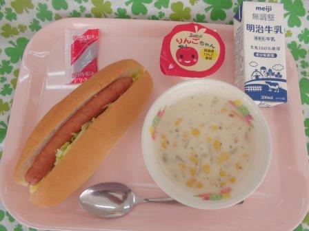 今日の献立は、手作りホットドック 牛乳 コーンチャウダー りんごゼリー でした。