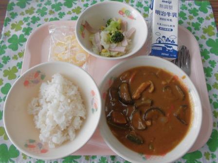 今日の献立は、麦入りごはん(自校炊飯)  夏野菜のカレー 牛乳  ゆで野菜