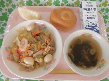 今日の献立は、米粉パン 牛乳 あんかけ焼きそば 中華風わかめスープ グレープ