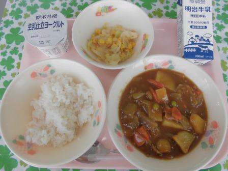 今日の献立は、麦入りごはん(自校炊飯) ポークカレー 牛乳  こんにゃくサラダ