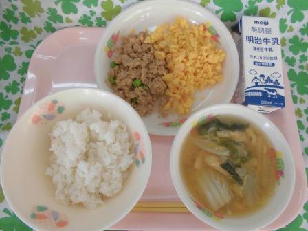 今日の献立は、麦入りごはん(自校炊飯) セルフ二色丼 牛乳 ほうれん草と白菜