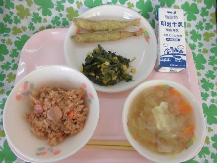 今日の献立は、栗おこわ(自校炊飯) 牛乳 いかのフライ ほうれん草ときゃべつ