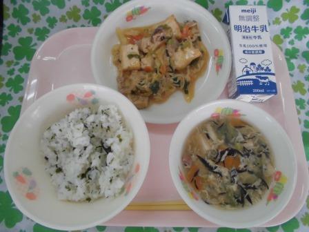 今日の献立は、わかめごはん(自校炊飯) 牛乳 生揚げの辛み炒め ひじきと卵の