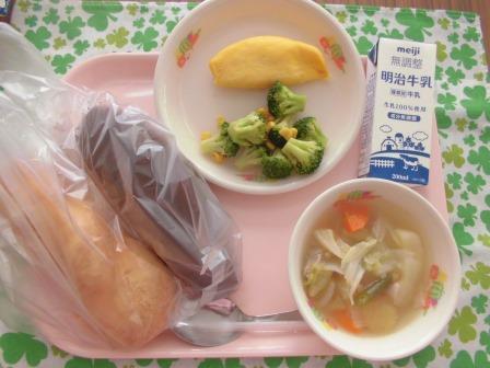 今日の献立は、セレクトの揚げパン(ココア・きなこ) 牛乳 ツナオムレツ ブロッコリー