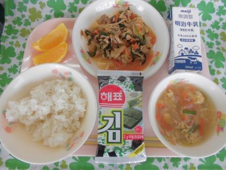 今日の献立は、麦入りごはん(自校炊飯) 牛乳 韓国のり プルコギ風炒め物