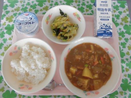今日の献立は、麦入りごはん(自校炊飯) ポークカレー 牛乳  こんにゃくと海草