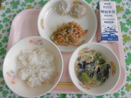 今日の献立は、麦入りごはん(自校炊飯) 牛乳 にらまんじゅう(2個) 切干し大根