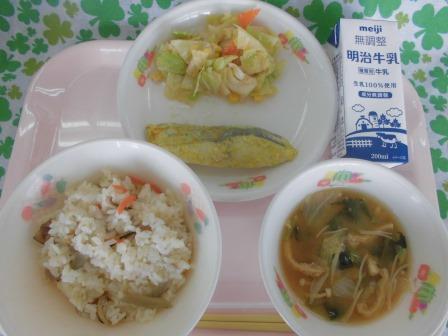 今日の献立は、鶏ごぼうの炊き込みご飯(自校炊飯) 牛乳 しいらのカレーマヨ焼き