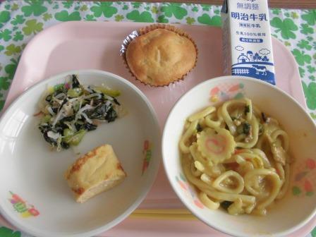 今日の献立は、カレーうどん 牛乳 太巻き卵(しょうゆ味) 中国菜ともやしのソテー