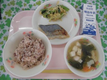 献立は、お赤飯(自校炊飯) ごま塩 牛乳 さわらの西京焼き からし和え