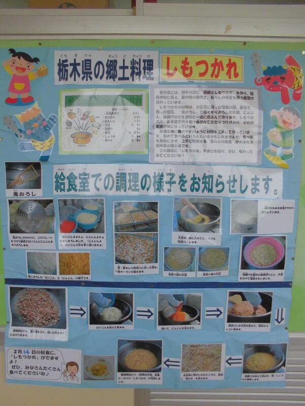 栃木県には古くから,初午の日に “赤飯としもつかれ” を作り,稲荷神社に備える風習が伝わっています。今年の初午が,2月2日(土)で給食がなかったため,「二の午」にあたる今日にしました。