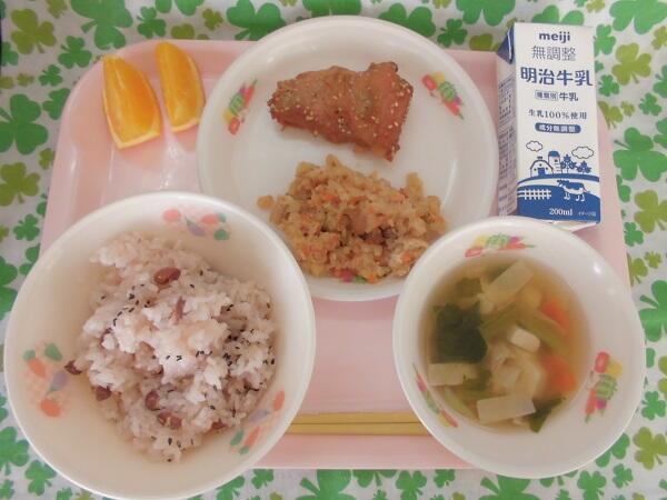 今日は栃木県の郷土料理です。 献立は,炊きおこわ(自校炊飯) ごま塩 牛乳 鶏肉の漬込み焼き しもつかれ 湯波のすまし汁 オレンジ(2切)でした。