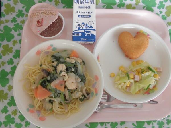 今日の献立は,スープスパゲティー 牛乳 ハートのコロッケ きゃべつとコーンのフレンチサラダ チョコプリン でした。 1日早めの『バレンタイン献立』です。