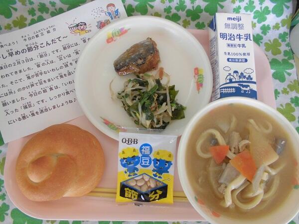 今日の献立は,米粉パン 牛乳 いわしの梅煮 ほうれん草と白菜のお浸し 味噌煮込みうどん 福豆 でした。2月3日の節分にちなみ,少し早めに節分献立にしました。