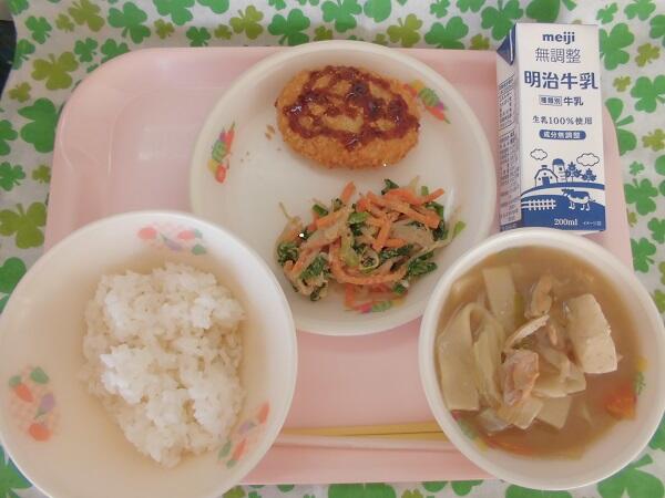 給食週間4日目。今日の献立は,麦入りごはん(自校炊飯) 牛乳 栃木県産豚肉コロッケ にらともやしのごま和え 鬼怒の船頭鍋 でした。