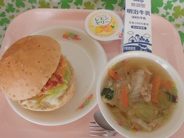 給食週間3日目は広島県の郷土料理です。今日の献立は,セルフワニバーガー 牛乳 白菜スープ レモンゼリーです。広島県北部の備北地域は,昔からワニ料理をよく食べています。「えぇ~、ワニ料理?!」と思う方もいらっしゃると思いますが,この地域ではサメのことをワニと呼んでいます。栃木県でよく食べられている「モロ」も同じサメの身なので,栃木県民にも馴染みがある食べ物です。デザートは,レモンの果肉が入ったレモンゼリー。広島県は国産レモンの生産量が日本一です。