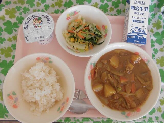 五代小給食週間2日目の献立は,麦入りごはん(自校炊飯) ごぼうのカレー 牛乳 ゆで野菜 和風ドレッシング 栃木県産生乳使用ヨーグルトでした。