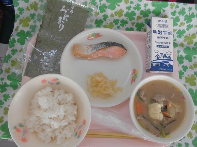 今日の献立は,麦入りごはん(自校炊飯) おにぎりのり 牛乳 千切りたくあん 焼き魚(ます) 法度汁です。