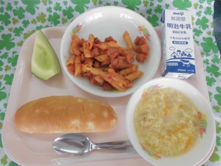 今日の献立は、パインパン 牛乳 ウインナーと白いんげん豆のパスタ 洋風卵スープ