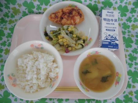 今日の献立は、発芽玄米入りごはん(自校炊飯)  牛乳 手作りチキンカツ