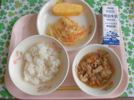 今日の献立は、麦入りごはん セルフ豚丼 牛乳 厚焼卵 バンサンスー でした。