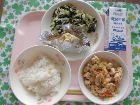 今日の献立は、麦入りごはん(自校炊飯) 牛乳 白身魚のみそチーズ焼き 磯辺和え