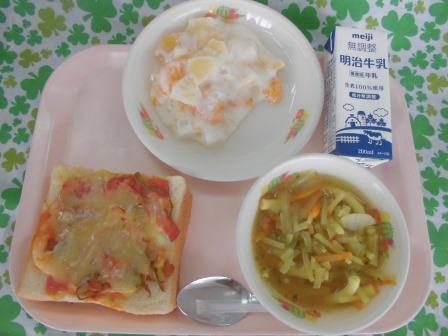 今日の献立は、ピザトースト 牛乳 マカロニのカレースープ ナタデココ入りフルーツ