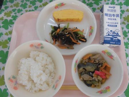 今日の献立は、麦入りごはん(自校炊飯) 牛乳 厚焼卵 豚肉と揚げなすの炒め物