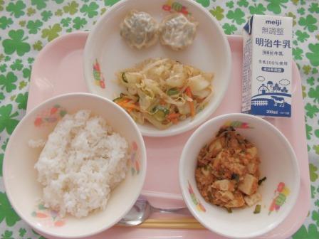 今日の献立は、麦入りごはん(自校炊飯) 牛乳 にらまんじゅう ナムル 野菜たっぷり