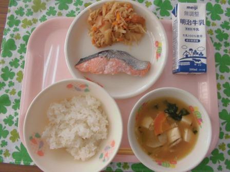 今日の献立は、麦入りごはん(自校炊飯) 牛乳 鮭の塩麹焼き 切干大根の煮付け