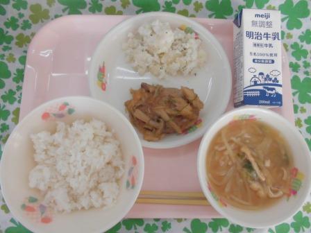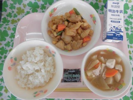今日の献立は、麦入りごはん(自校炊飯) ひじきのり(佃煮) 牛乳 鶏肉と大豆の