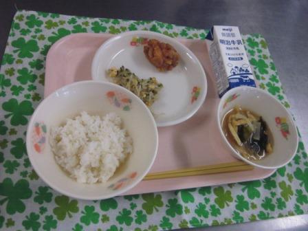 今日の献立は、麦入りごはん(自校炊飯) 牛乳 もろの和風マリネ 磯辺和え