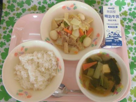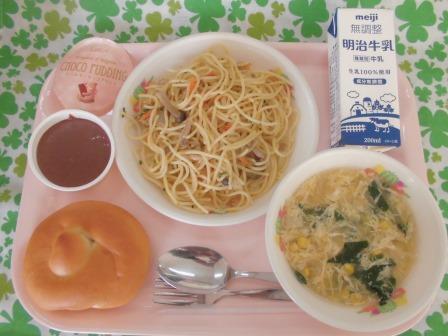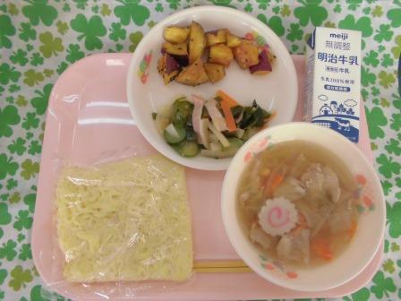 今日の献立は、野菜たっぷり塩ラーメン 牛乳 大学芋 わかめの中華サラダ