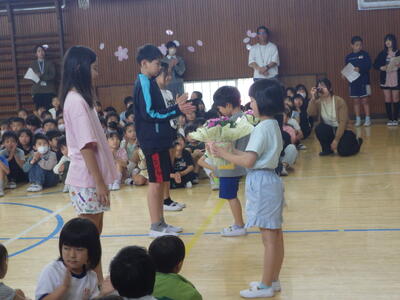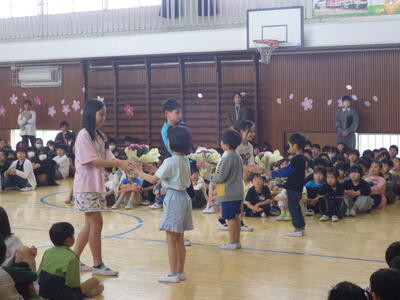 4月14日(火)離任式が13:30から体育館で行われました。代表児童からの感謝の言葉と花束を受け取った後、名残惜しい思いと感謝の言葉で別れのあいさつをされました。子供たちも先生方への感謝の思いを伝えることができました。