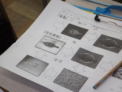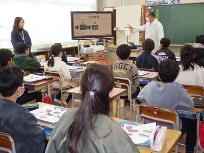 今日は,4年生の理科「ものの温度と体積」の単元で空気はあたためると体積が大きくなり、冷やすと体積が小さくなることを理解させるのに、丸底フラスコを湯につけてあたためたり、氷水につけて冷やしたりして、ガラス管の中のゼリーの位置の変化を見る実験をしました。あたためると空気の体積が大きくなるのでゼリーが上に行き、冷やすと空気が小さくなるので下に行く現象を見て驚いているようでした。