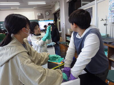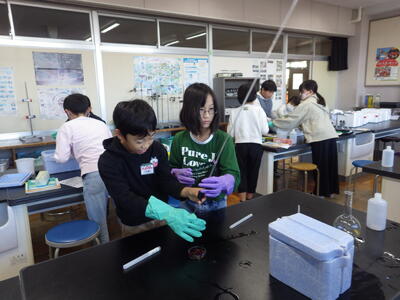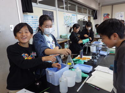 11月19日(水)の1校時に6年生理科「大地のつくりと変化」の単元で,公開授業が行われました。水のはたらきによる地層のでき方を調べるため,たい積モデルで実験しました。粒の大きい,れき・砂・どろの順にたい積していき,それが何回も繰り返されるうちに地層ができることを理解させることができました。どの児童も生き生きと実験に取り組むことができました。
