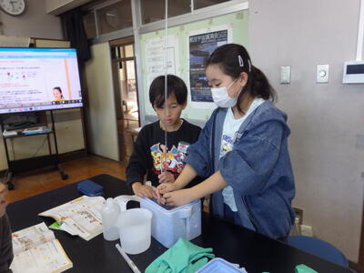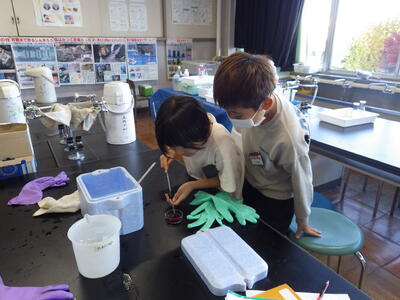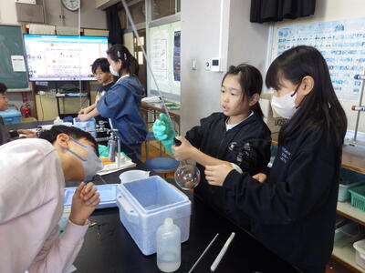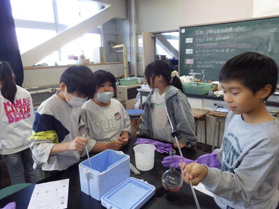 今日は,4年生の理科「ものの温度と体積」の単元で空気はあたためると体積が大きくなり、冷やすと体積が小さくなることを理解させるのに、丸底フラスコを湯につけてあたためたり、氷水につけて冷やしたりして、ガラス管の中のゼリーの位置の変化を見る実験をしました。あたためると空気の体積が大きくなるのでゼリーが上に行き、冷やすと空気が小さくなるので下に行く現象を見て驚いているようでした。