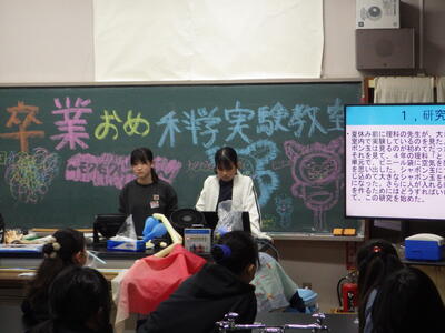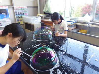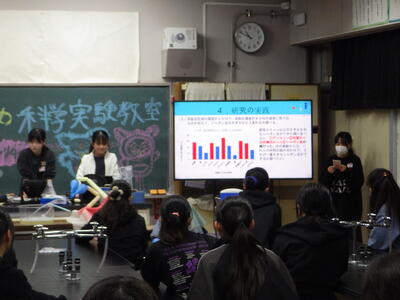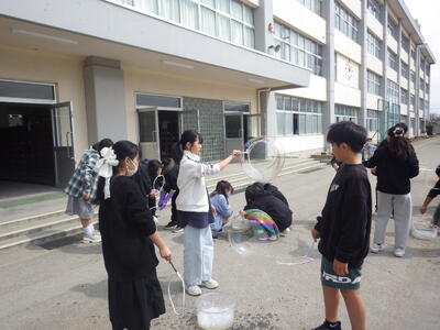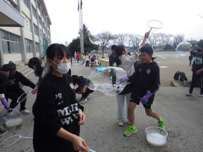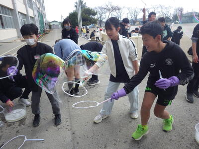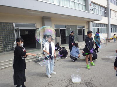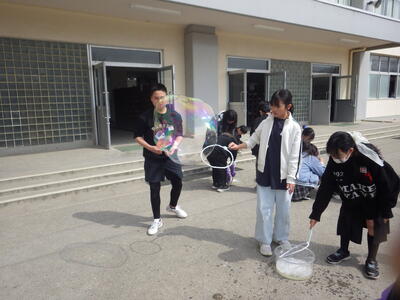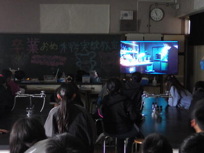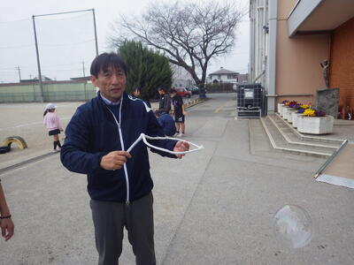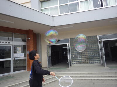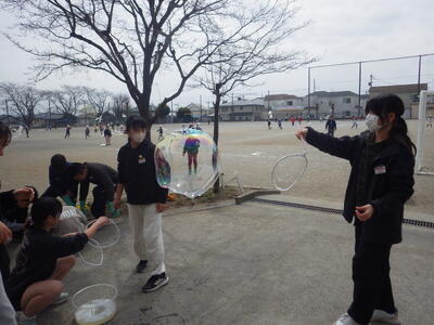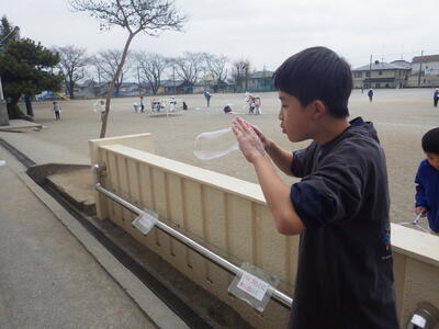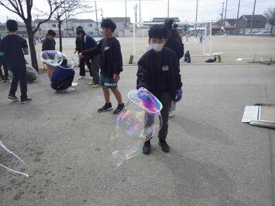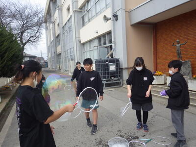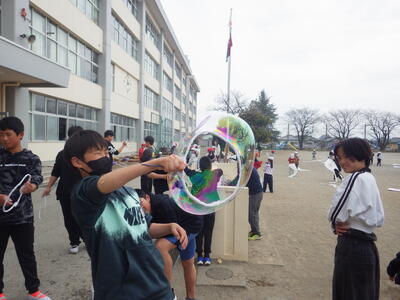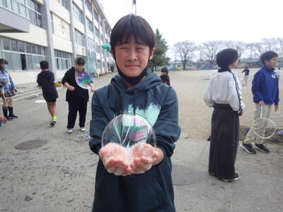 3月18日(水)に「卒業おめでとう、科学実験教室」を行いました。今回も盛りだくさんな内容で実施しましたので、楽しい思い出になったと思っています。動く絵画、風船を使った実験、手回し発電機で電気を起こして人形を動かす実験、ジャイロ効果を使ったCD・ホバークラフト・aiで作った怖い話の動画など、様々な内容で準備しました。また、理科研究展覧会並びに発表会の発表の部門に参加した児童たちに発表してもらいました。タイトルは「巨大シャボン玉に挑戦!」です。この研究は、人が入れる位巨大なシャボン玉を作りたいという動機で始め、半年以上をかけて実験してきたものです。その結果、洗剤と砂糖・グリセリンを混ぜたものが一番大きなシャボン玉ができることが分かりました。発表のあと、見つけた材料で皆で遊びました。どの子からも笑顔が溢れていて、とても楽しそうでした。