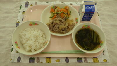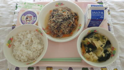 今日の給食は,麦入りご飯・豚肉のしょうが焼き・とうがんのゴマ酢あえ・みそ汁です。
