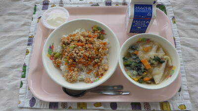 今日の給食は,麦入りご飯・牛乳・セルフとりそぼろ・ワンタンスープ・豆乳プリンです。