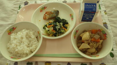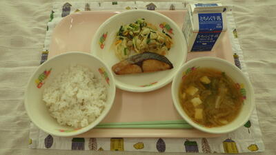 今日の給食は,麦入りごはん・牛乳・サワラのもろみ漬け・かいそうサラダ・さといもの中華煮です。