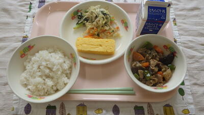 今日の給食は,麦入りご飯・牛乳・あつやき卵・ぶた肉とあげなすめ・アーモンドサラダです。