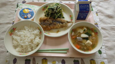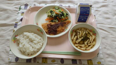 今日の給食は,麦入りご飯・牛乳・たいのフライ・からしあえ・もやしとわかめのみそ汁です。