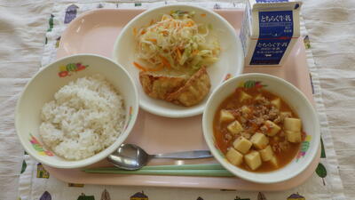 今日の給食は,麦入りごはん・牛乳・あげぎょうざ・マーボー豆腐・バンサンスウです。