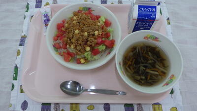 今日の給食は,麦入りごはん・牛乳・セルフタコライス・もずくスープ・かみかみこんぶです。