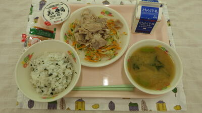 今日の給食は,わかめご飯・牛乳・豚しゃぶサラダ・ひややっこ・みそ汁です。