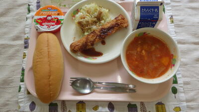 今日の給食は,白身魚のチーズフライ・ボイルキャベツ・さつま汁です。
