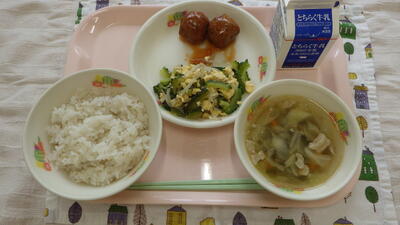 今日の給食は,麦入りご飯・牛乳・ゴーヤーチャンプルー・肉団子・茎わかめのスープです。
