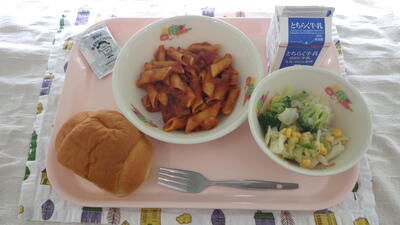 今日の給食は,スパゲティ・ミートソース・こんにゃくサラダ・ベビーチーズです。