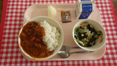 今日の給食は,麦入りごはん・シーフードカレー・牛乳・ゆで野菜・イタリアンドレッシング・ヨーグルトです。
